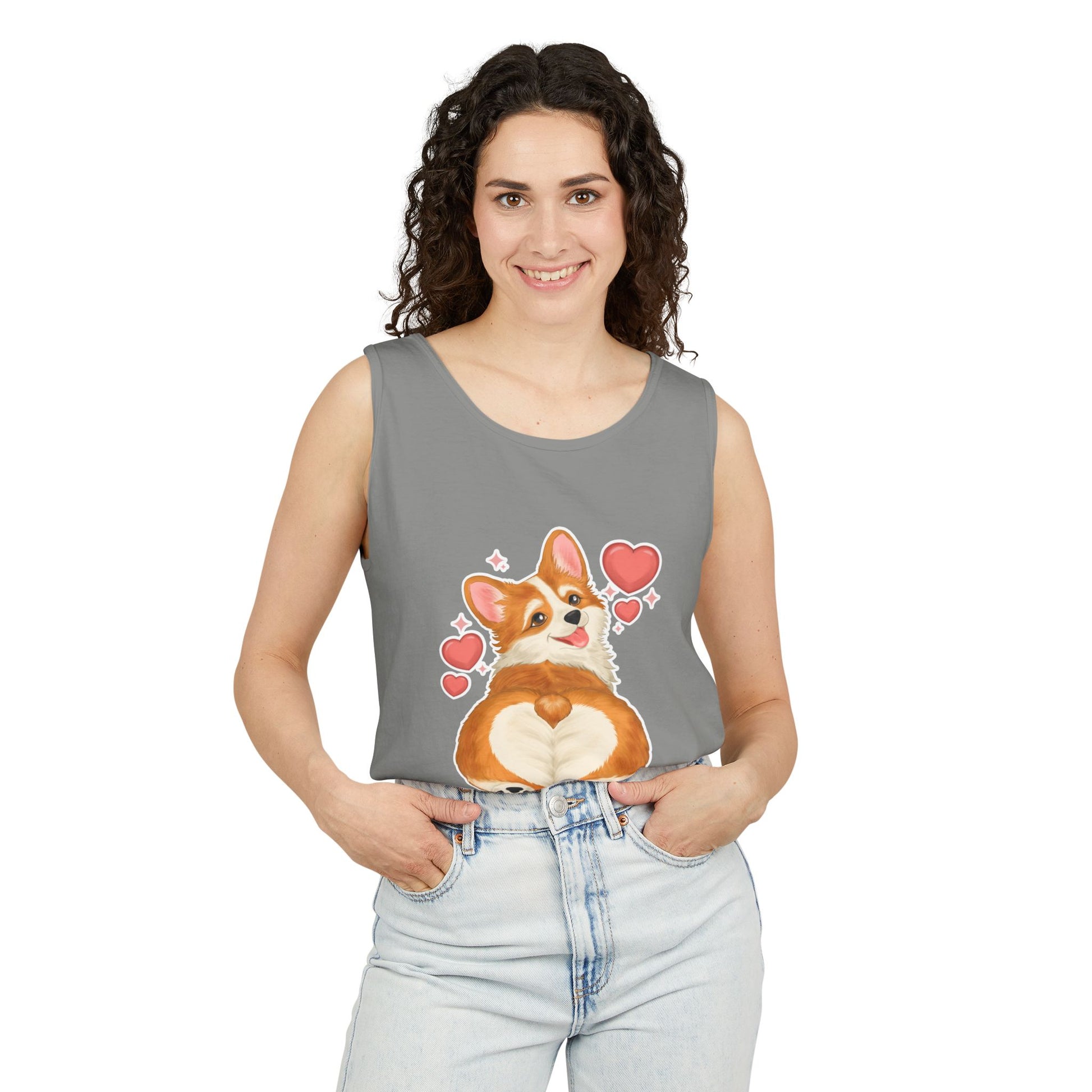 Soft, relaxed, and full of warm-hearted charm — this garment-dyed tank brings a playful corgi illustration to everyday wear. The watercolor-style corgi sits with its paws forming a heart against a gentle cloud of floating hearts, giving the tank a cozy, joyful vibe. The medium-weight, ring-spun cotton feels substantial yet soft, and the garment-dyed finish adds a lived-in color and texture that gets better with each wash. Wear it on weekend walks, at dog meetups, or layered under a cozy cardigan for a casual look that quietly says you love corgis and comfort.