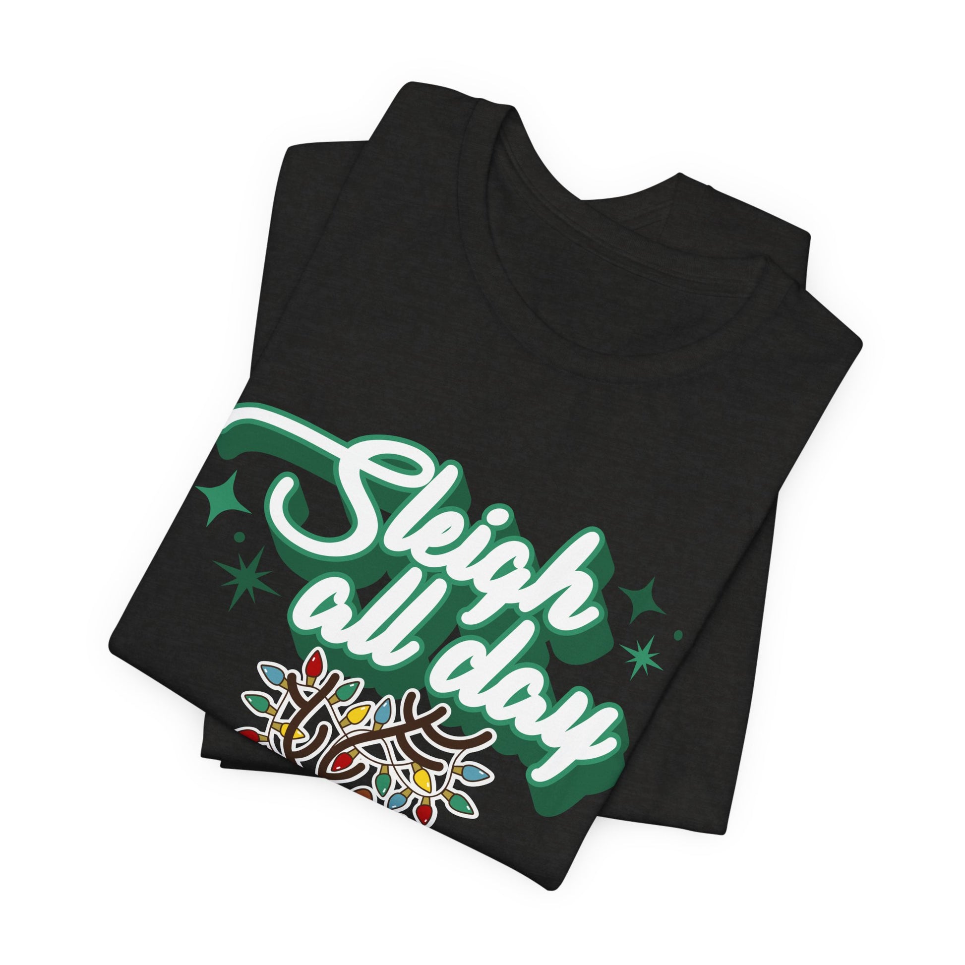 Bring playful holiday cheer to casual days with this lightweight jersey tee. A spirited corgi trots across the chest, antlers twinkling with holly and lights, pulling a tiny sleigh beneath the hand-lettered phrase “Sleigh all day.” The design feels warm and whimsical — like a cozy winter walk with friends and laughter in the air. Breathable Airlume combed cotton keeps the tee soft next to skin and easy to layer under a cardigan or over a long-sleeve on chilly mornings. Wear it to festive family gatherings, neighborhood tree-lighting nights, or casual holiday markets to show off a sense of humor and seasonal joy without shouting for attention. The clean crew neckline and retail fit make it comfortable for everyday wear, while subtle print placement keeps the look polished and approachable.